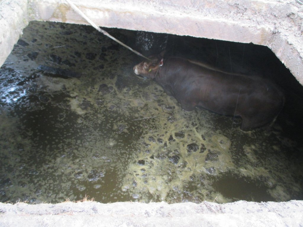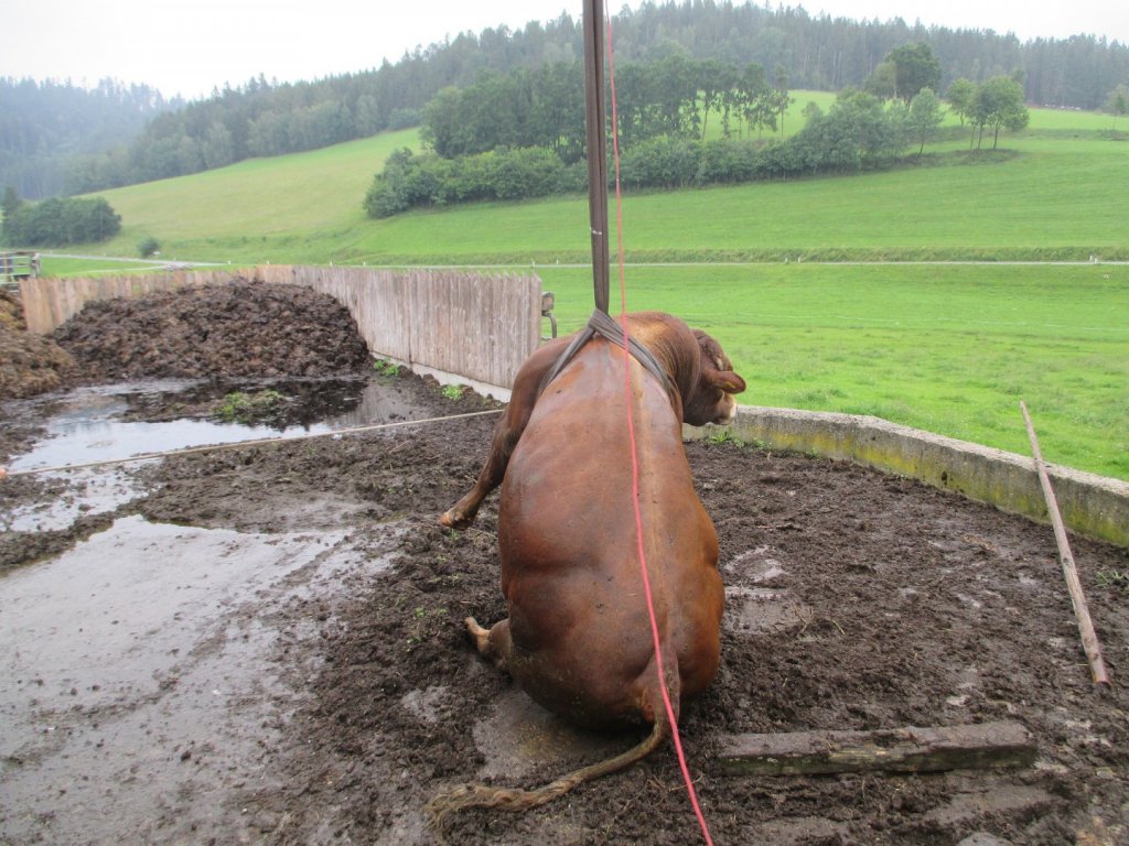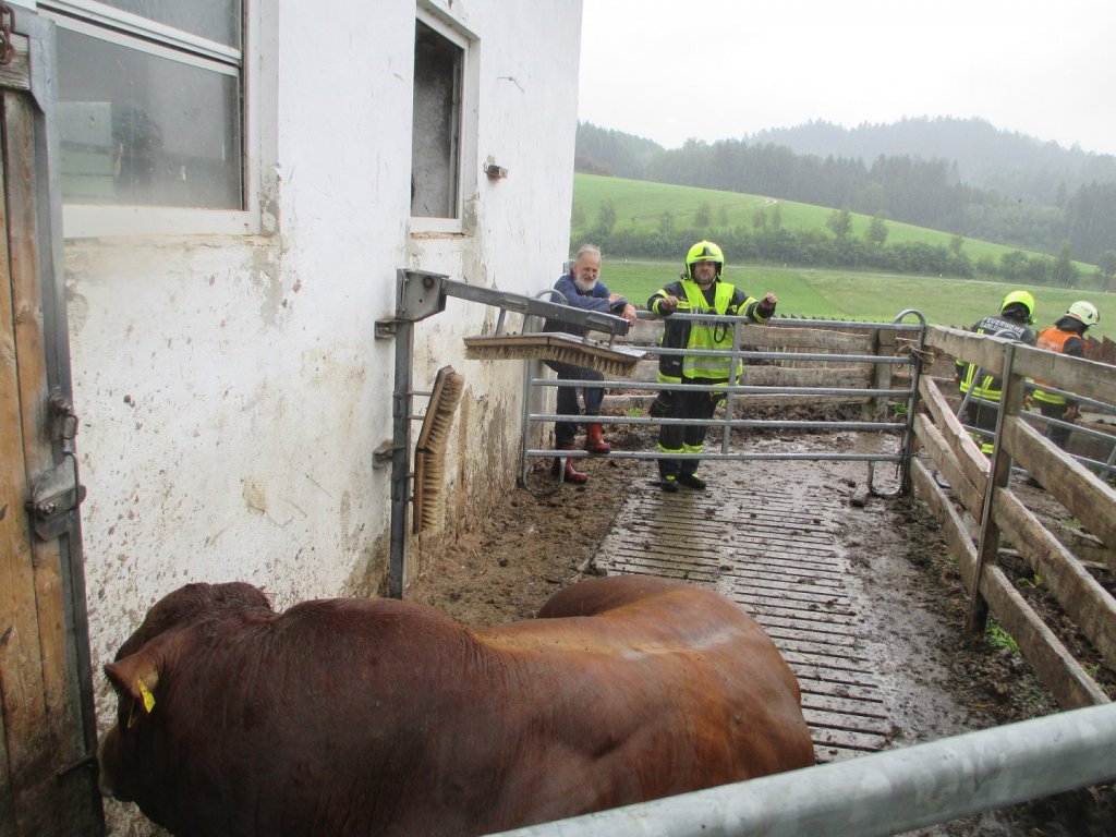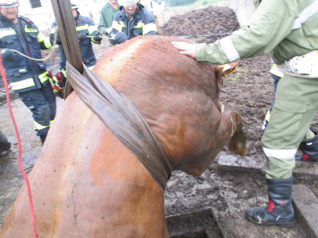 Wir konnten innerhalb kürzester Zeit mit dem LFB-A2 ausfahren und in weiterer folge konnte mit dem Kommandofahrzeug nachgerückt werden. Am Einsatzort konnte festgestellt werden, dass der Stier sich in der Güllegrube befand. Gemeinsam mit der Feuerwehr Sarleinsbach, die Vorort die Einsatzleitung Übernahm, dem Tierarzt und einer Ortsansässigen Baufirma mit einem Kran, konnte der Stier Tier gerecht aus der Grube gehoben werden. In weiterer folge wurde er in seinen Stall gebracht.