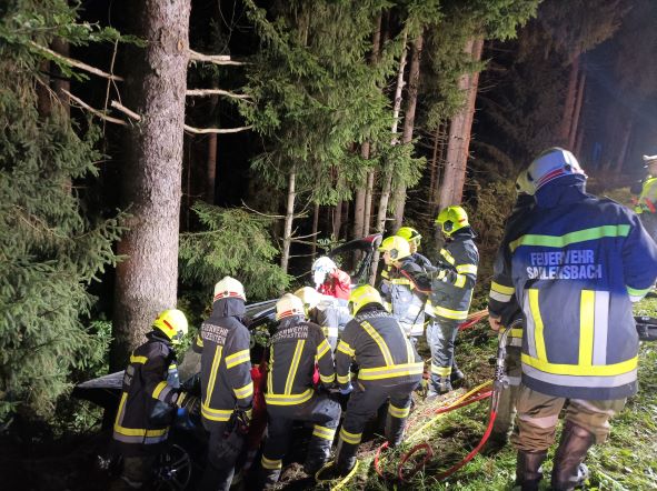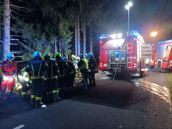 Am 30. September 2022 wurden wir um 23:43 Uhr mit dem Einsatzstichwort „Eingeklemmte Person“ alarmiert. Mit allen drei Fahrzeugen rückten wir zur Unfallstelle beim Wald zwischen Lämmerstorf und Neumühle aus. Dort war ein Auto mit zwei Insassen in Fahrtrichtung Sprinzenstein von der Fahrbahn abgekommen und gegen einen Baum geprallt. Die beiden Insassen waren eingeklemmt und wurden in Zusammenarbeit mit der FF Sarleinsbach, der Rettung und dem Notarzt geborgen.
