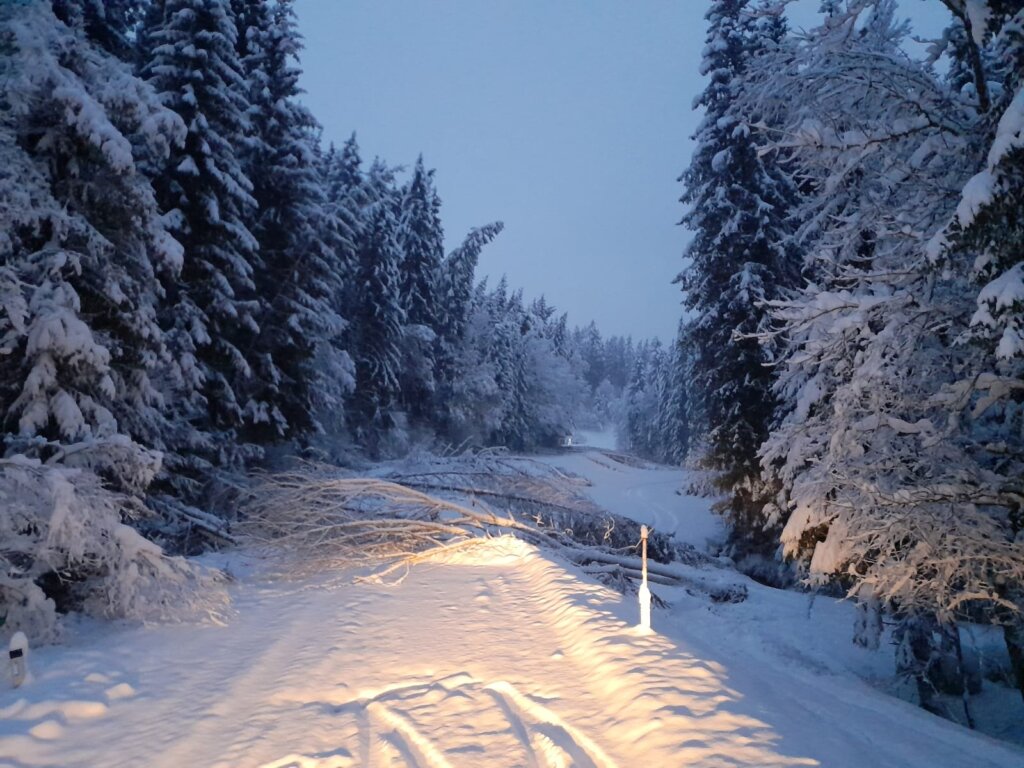 In der Nacht vom 1. auf 2. Dezember heulte um 00:16 Uhr das erste Mal die Sirene. Mit dem Einsatzstichwort „Baum über Straße“ rückten wir auf der L588 Richtung Hühnergeschrei aus und entfernten mehrere Bäume, die die Straße versperrten. Auch auf der L1527 (Höhe Neumühle) entfernten wir einen Baum, der die Straße blockierte. Es war dies der Beginn einer langen Einsatzserie.
