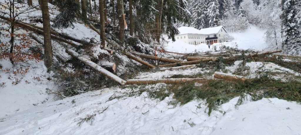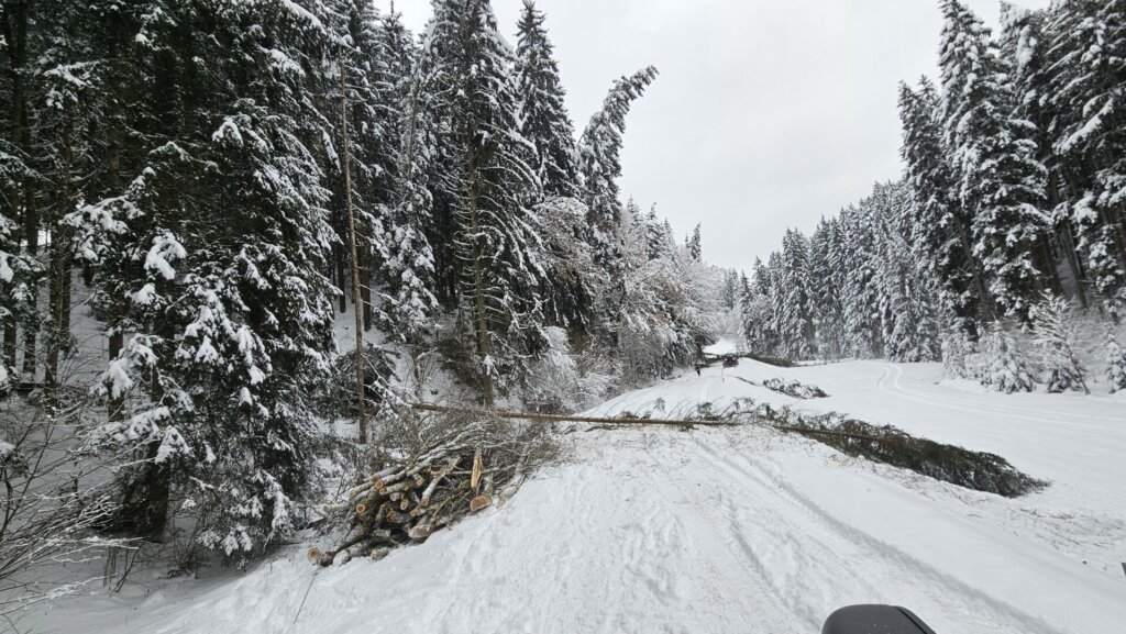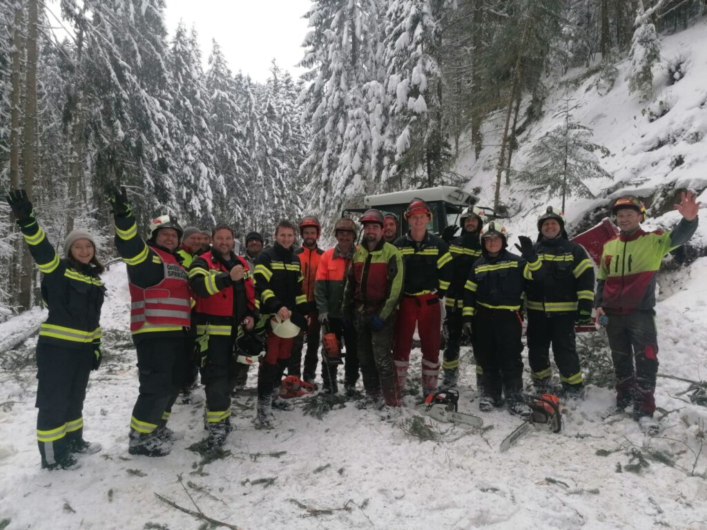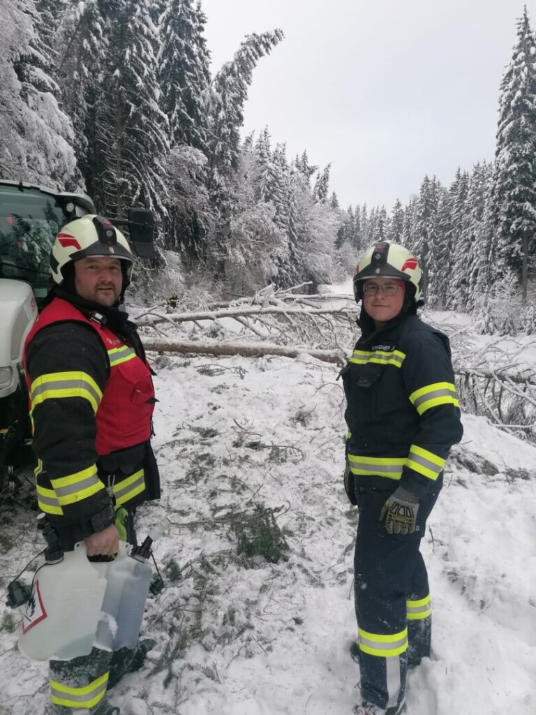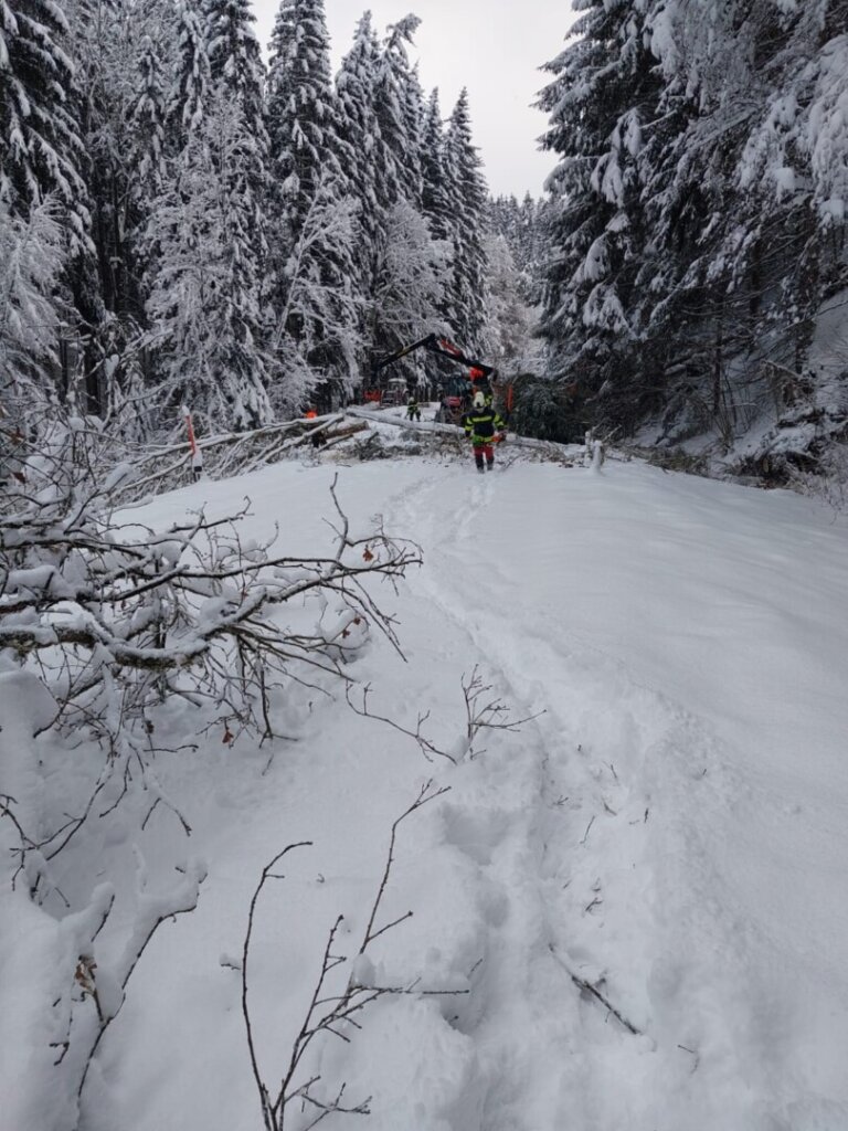 Parallel dazu kümmerte sich eine dritte Mannschaft um nahezu umgestürzte Bäume auf der L1527 (Lämmerstorf): Entweder sie wurden gefällt oder von der Schneelast befreit, sodass die Straßen nun hoffentlich lange frei bleiben. Unter erheblichem Personaleinsatz gelang es, alle umgestürzten Bäume aufzuforsten und in Absprache mit den Waldbesitzern an geeigneten Plätzen zu lagern.