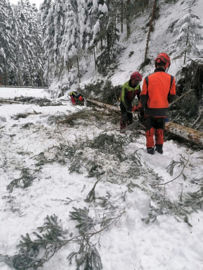 Leider entspannte sich die Wettersituation nicht wie erhofft Samstag Nachmittag, sodass wir erst Sonntag Früh mit dem Freiräumen des gesperrten Straßenstücks Sprinzenstein-Hühnergeschrei beginnen konnten. Ein Teil der Mannschaft arbeitete sich von Sprinzenstein Richtung Salzbrücke vor (siehe Bild unten), ein anderer Teil aus der entgegengesetzten Richtung.