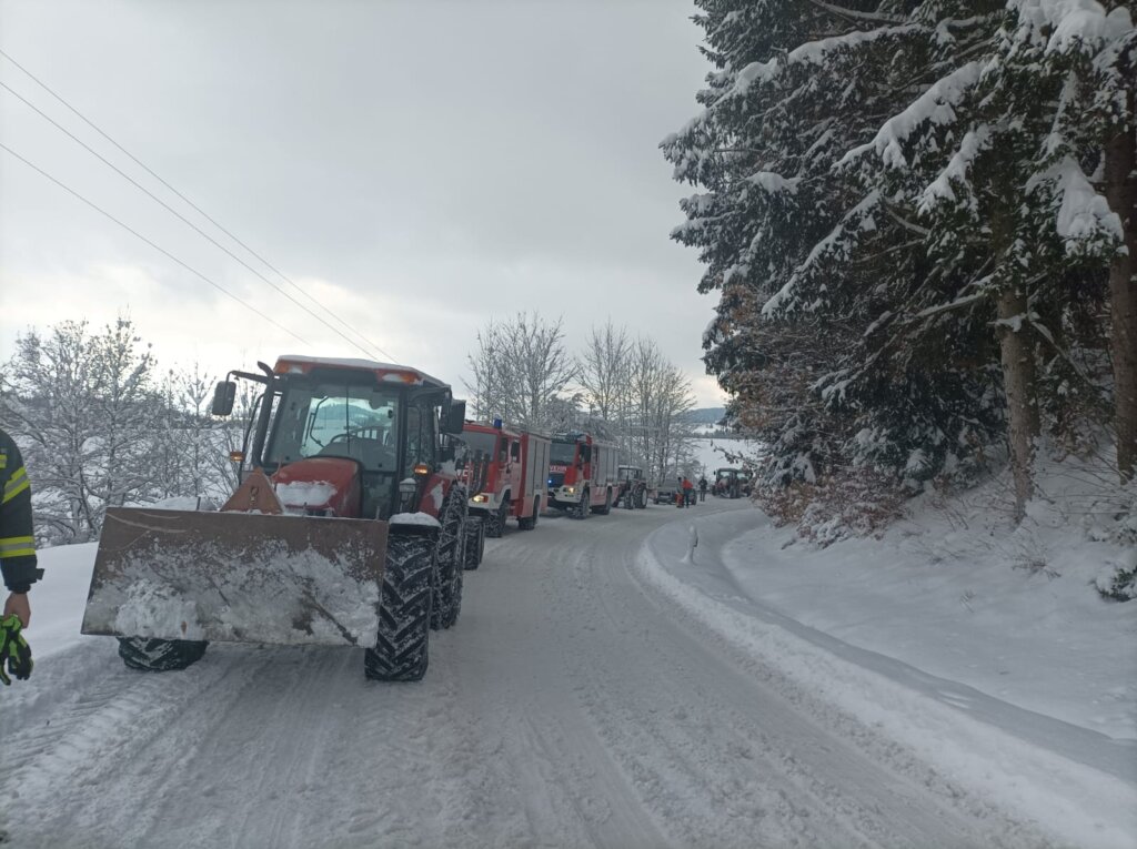 Knapp zwei Stunden nach Wiederherstellung der Einsatzbereitschaft riss uns die Sirene um 3:41 Uhr erneut aus dem Schlaf. Wieder rückten wir zum Einsatzstichwort „Bäume über Straße“ auf der L588 aus. Unmittelbar vor der Waldeinfahrt mussten wir feststellen, dass sehr viele Bäume aufgrund der Schneelast gefährlich über die Straße ragten und umzustürzen drohten. Zwei Mann erkundeten daher zu Fuß und unter höchster Vorsicht die Situation, der Rest der Mannschaft blieb außerhalb vom Wald im Fahrzeug.
