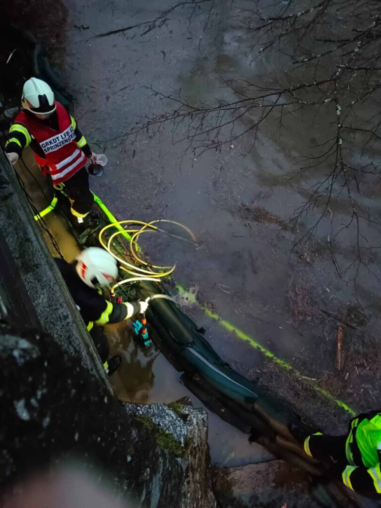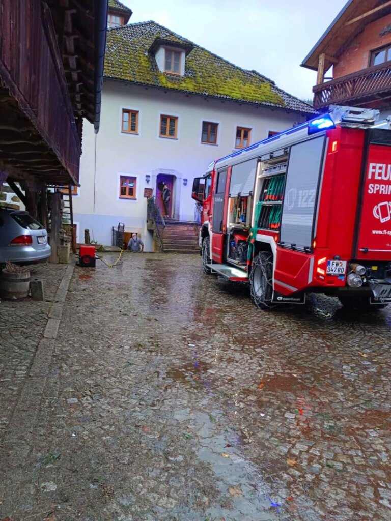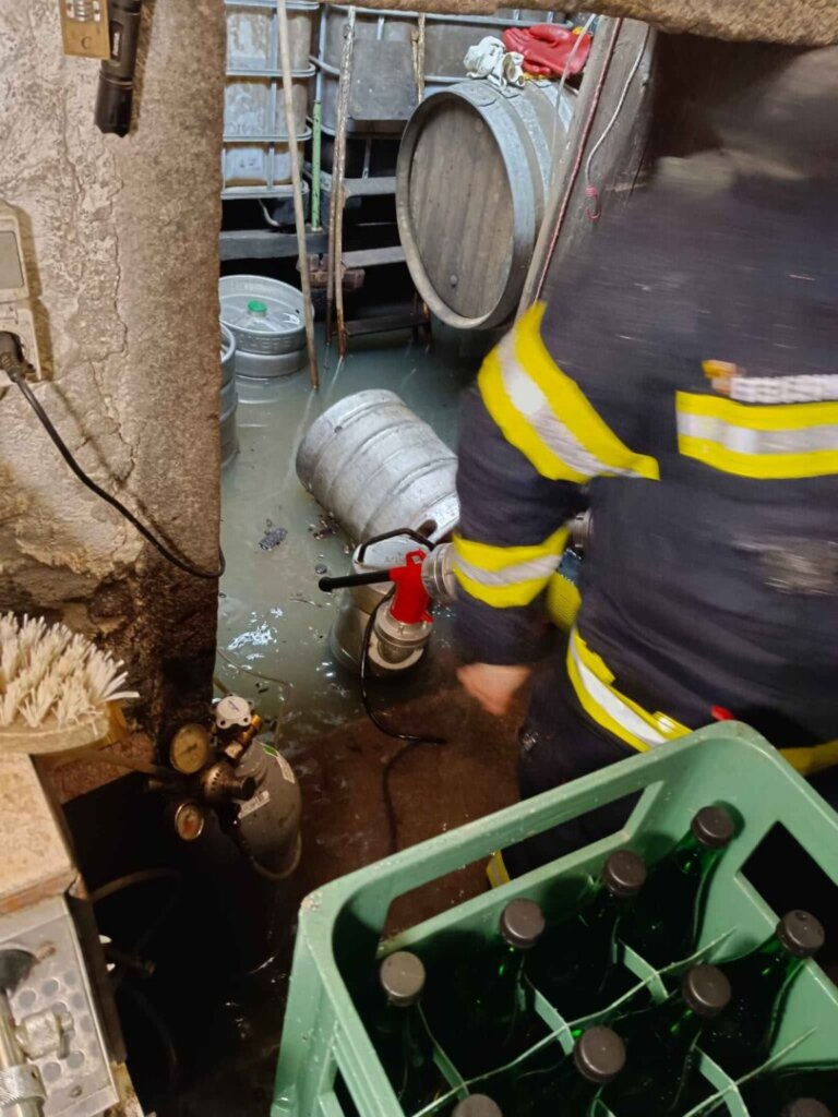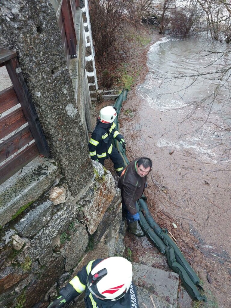 Durch den dauernden Starkregen sind viele Kanäle und Abwasserführungen überfordert. Der mittlerweile 5te Einsatz an diesem Tag war mittels Sirenenalarmierung. Um 14:30 rückten wir zur Koblmühle aus. Die kleine Mühl war bereits weit über die Ufer getreten und der Keller stand unter Wasser. Vor Ort pumpten wir den Keller mit Hilfe von Tauchpumpen aus. In der Zwischenzeit verhinderten wir mittels Sandsäcken, Siloplanen, Schaltafeln und Dichtbändern das weitere Eindringen von Wasser. Aufgrund des andauernden Regens kommt nach wie vor Wasser nach und so laufen die Pumpen weiter. Hoffentlich geht der Wasserpegel bald zurück.